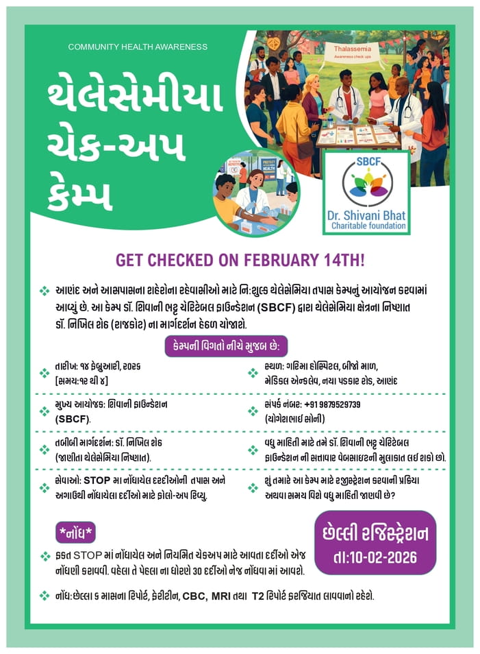 As a part of re-evaluation & continued management of registered STOP patients, we have organised a camp on 14th February 2026, under the tutelage of Dr Nikhil Sheth, Rajkot - a renowned & dedicated Paediatrician for Thalassemia.