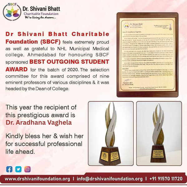 Dr Shivani Bhatt Charitable Foundation ( SBCF) proudly associated with The Best Outgoing Student Award , Batch 2020 @ NHL Municipal Medical College, Ahmedabad.