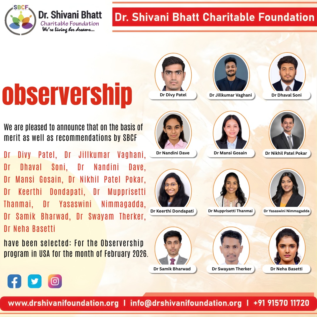 Dr Shivani Bhatt Charitable Foundation ( SBCF ) , feels very much proud about three of its students were judged Residents of the month at St Marry’s St Clair Hospital, NJ . SBCF is shining through your this achievement & will become lighthouse for upcoming students. Congratulations.